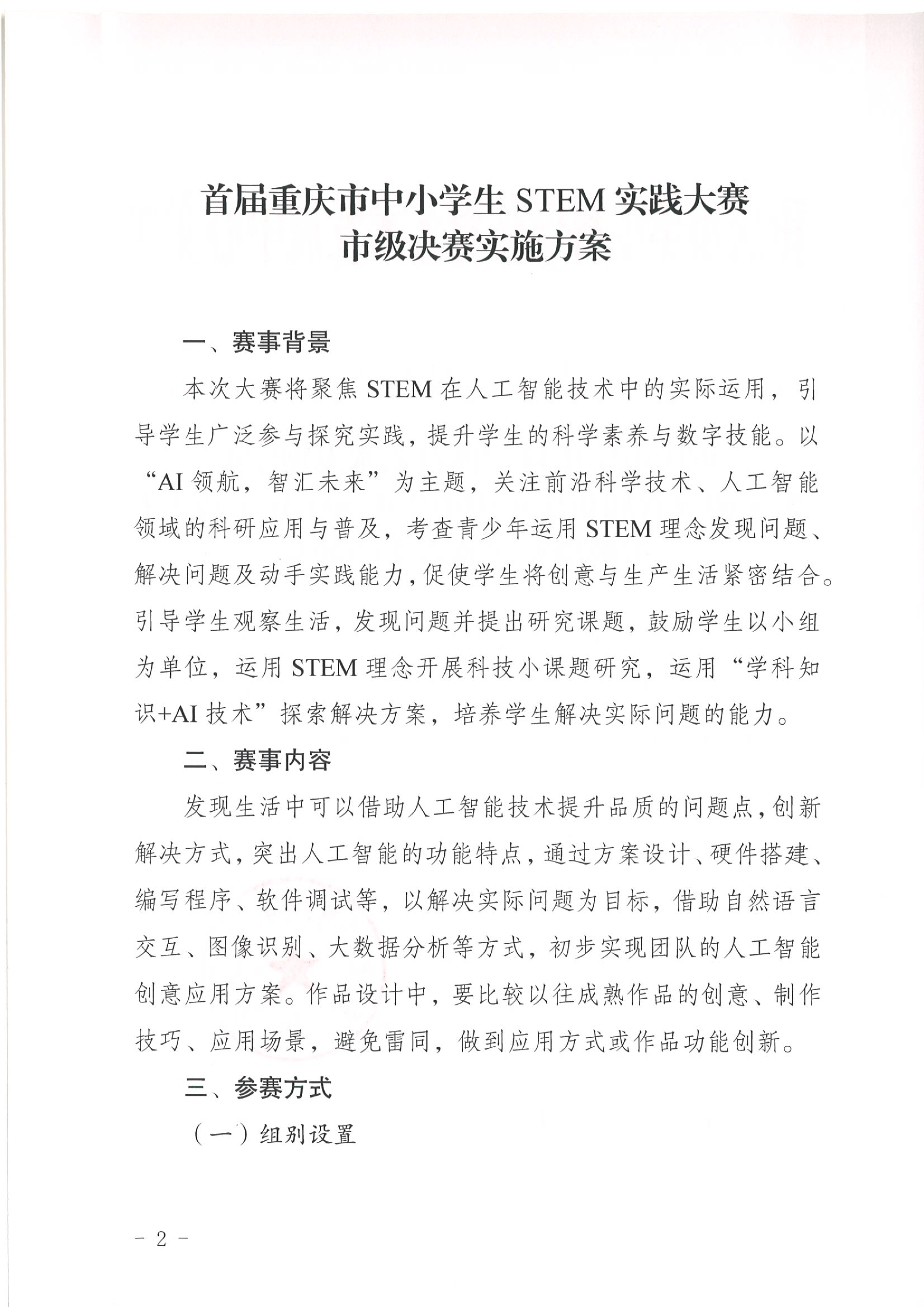 为贯彻落实《重庆市教育委员会关于实施基础教育阶段STEM教育行动计划的通知》(渝教基函〔2024〕88号)文件精神,深化中小学科学教育改革,推动我市基础教育阶段STEM教育高质量发展,提升学生解决实际问题的能力,培养面向未来的具有创新性和适应力的社会主义建设者和接班人,决定举办首届重庆市中小学生STEM实践大赛。现将有关事项通知如下。