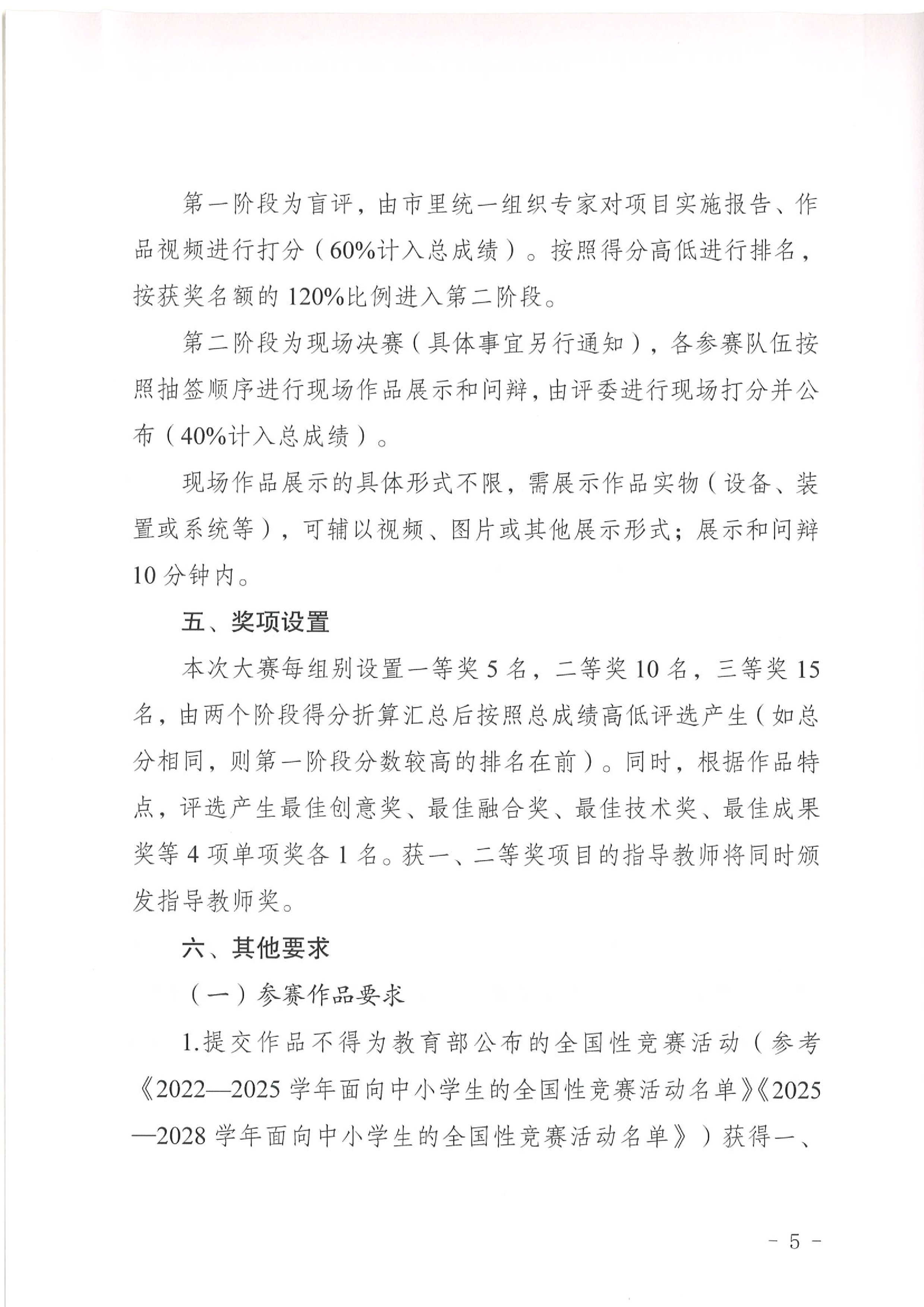(三)市级决赛:2025年11月下旬,举行市级决赛。各区县每组别原则上推荐1—2个项目参加市级决赛。决赛采用现场作品展示和问辩方式进行,重点展示作品选题来源、教学目标、项目实施过程、项目成果、反思评价等。